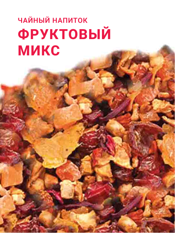 Гибискус с кусочками плодов шиповника, спелого яблока, ананаса, папайи, ягодами клюквы и насыщенным сладким ароматом. Богат витамином С.