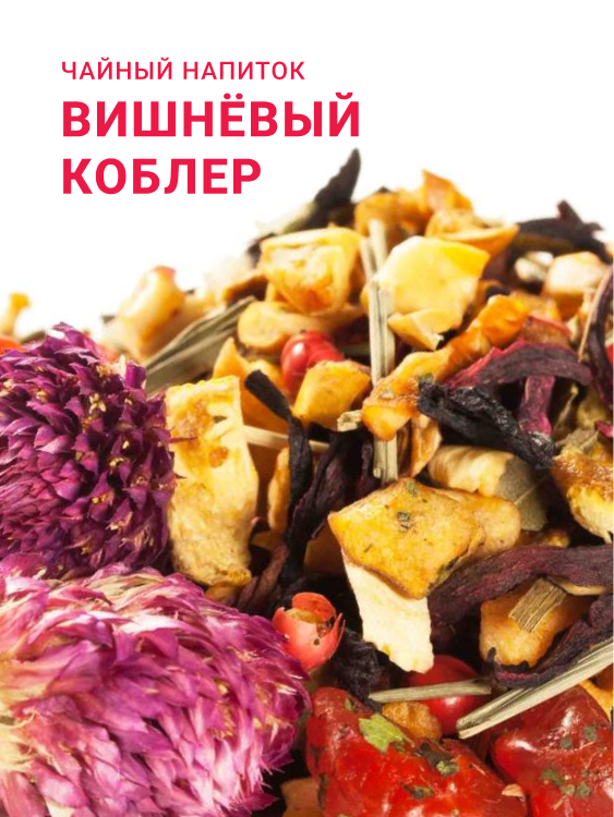 Состав: кубики яблока, вишня сушёная, цедра апельсина, гибискус, свёкла сушёная, лист грецкого ореха, лимонная трава, цветки клевера, перец шинус, ароматизаторы.