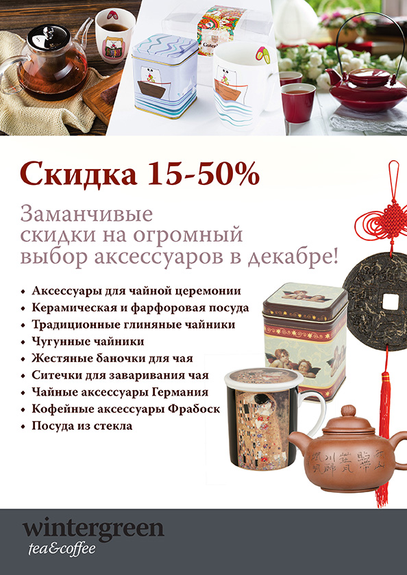 В декабре последний месяц тотальной распродажи аксессуаров. Скидка от 15 до 50% на большой ассортимент. В эти последние дни уходящего года побалуйте себя посудой отличного качества, баночками для хранения чая, чашками из костяного фарфора и многим другим.