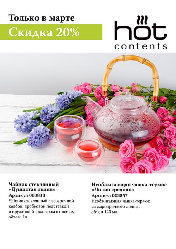 В марте мы завариваем чай в стеклянном чайнике "Душистая лилия" (артикул 003838) и пьем из необжигающей чашки-термоса "Лилии средней" (артикул 003857). Вся коллекция стеклянной посуды Hot Contents создана первоклассными дизайнерами из качественных материалов и каждый артикул назван в честь прекрасного цветка.