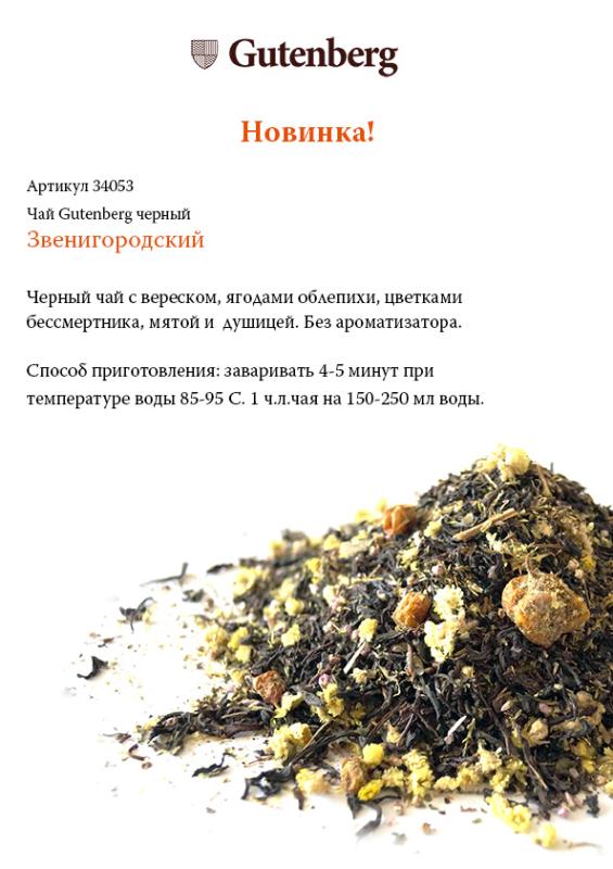 Чай "Звенигородский": новый композиционный чай в коллекции Gutenberg. Идеальное сочетание черного индийского чая Ассам с натуральными полезными компонентами: мята, душица, цветы бессмертника, ягоды облепихи.