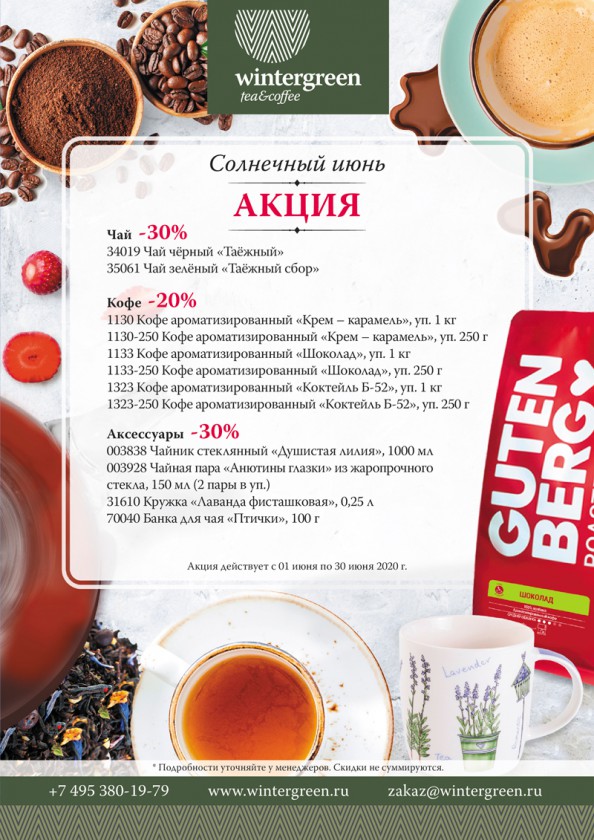 Специально для Вас мы подготовили скидки: - на чай -30% - на кофе - 20% - на аксессуары - 30% Подробности уточняйте у менеджеров. Скидки не суммируются.