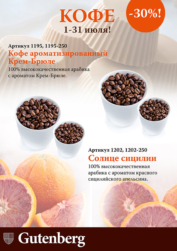 100% арабика с ароматом крем-брюле или сочного сицилийского апельсина! Весь июль скидка на ароматизированный кофе 30%!