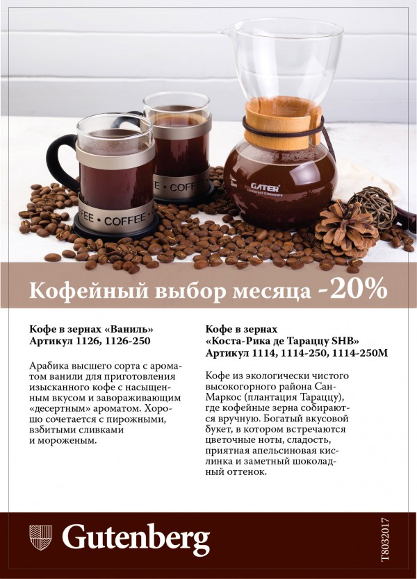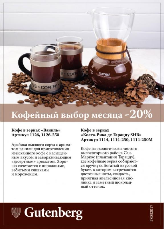 С 1 по 30 апреля скидка 20% на кофейный выбор месяца - кофе "Ваниль" (артикул 1126,1126-250), кофе "Коста-Рика де Тараццу SHB (1114,1114-250,1114-250М).