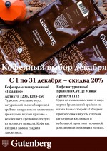 Кофейный выбор декабря и 20% скидка на следующие позиции - кофе в зернах ароматизированный "Пралине" в упаковке 1 кг и 250 грамм (артикул 1203,1203-250) и кофе в зернах натуральный Бразилия Сул Де Минас в упаковке 1 кг (артикул 1112).