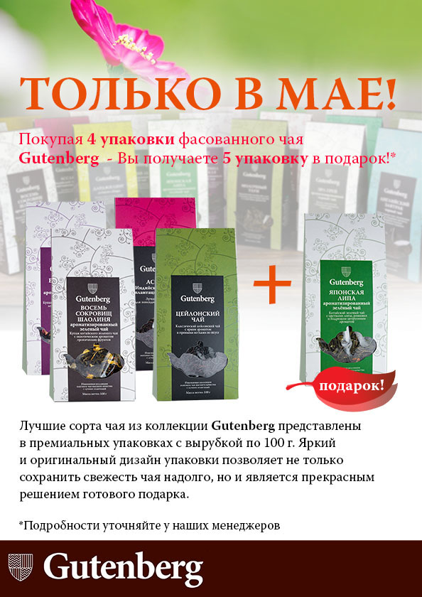 Покупая 4 упаковки чая Gutenberg по 100г, Вы получаете ещё одну в подарок!