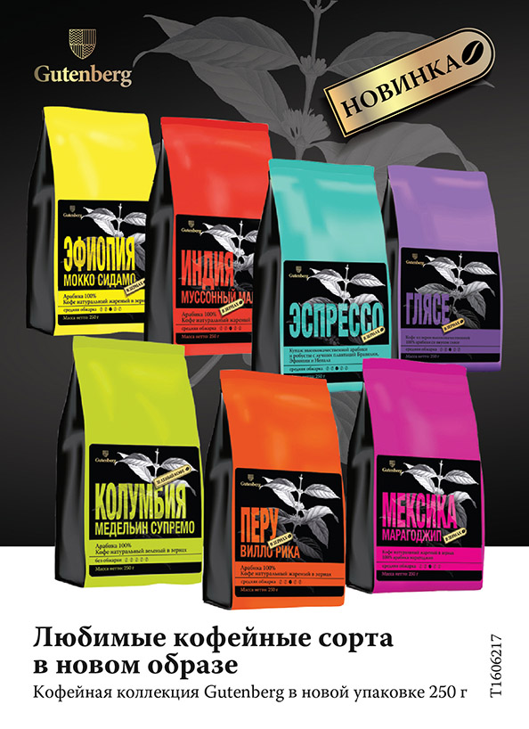 Теперь Ваши любимые кофейные сорта Gutenberg в новой упаковке 250 г. Яркие вакуумные упаковки прекрасно сохраняют аромат и вкус свежеобжаренного кофе и привлекут внимание клиентов.