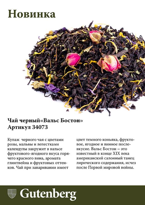 Купаж черного чая с цветами розы и мальвы и лепестками календулы закружит в вальсе фруктового-ягодного вкуса горячего красного вина и аромата глинтвейна и фруктовых оттенков. Чай при заваривании дает цвет темного коньяка, имеет фруктовое, ягодное и винное послевкусие. Вальс Бостон – это известный в конце XIX века американский салонный танец лирического содержания, исчез после Первой мировой войны.