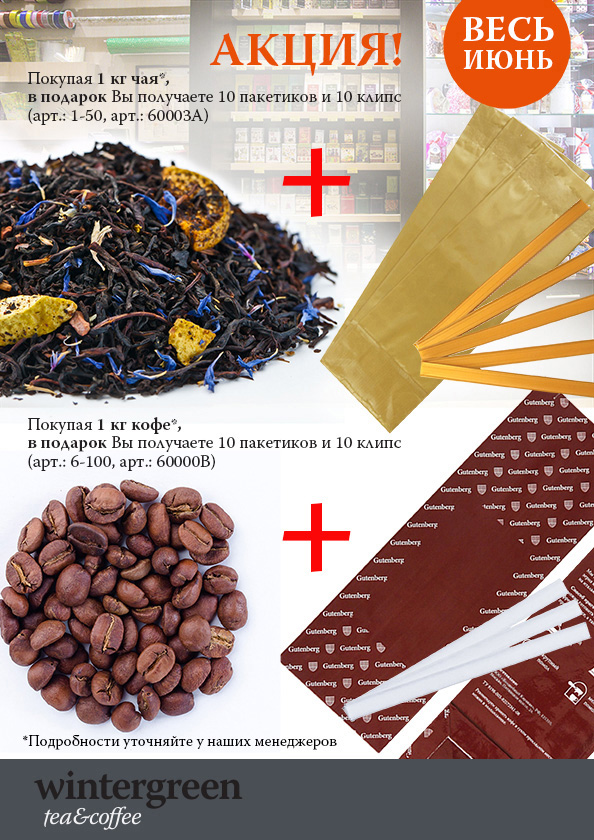 Покупая 1кг любого чая и кофе Gutenberg и Prospero, вы получаете 10 пакетиков и клипс бесплатно.