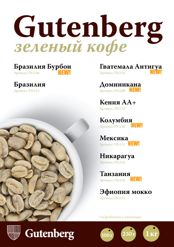 Рады Вам сообщить, что теперь в нашем ассортименте стало еще больше зеленого кофе: из Бразилии, Гватемалы, Доминиканы, Колумбии, Мексики, Никарагуа, Кении, Танзании и Эфиопии. Для Вашего удобства мы предлагаем фасовку по 100 г, 250 г и 1 кг.