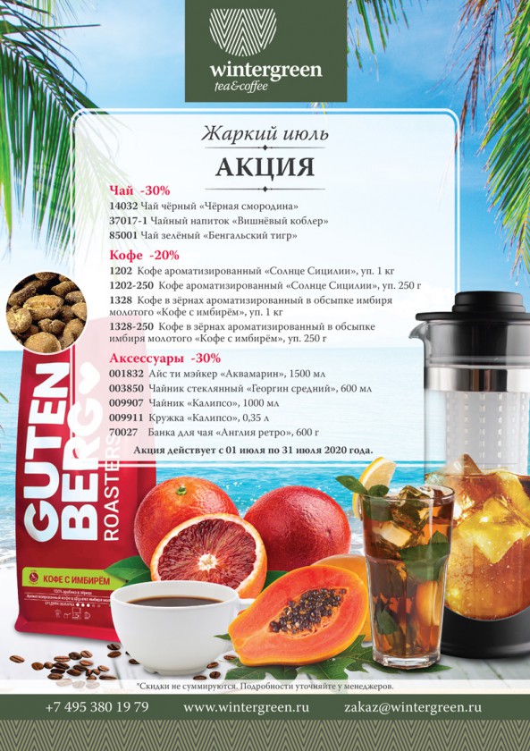 Специально для Вас мы подготовили скидки: - на чай -30% - на кофе - 20% - на аксессуары - 30% Подробности уточняйте у менеджеров. Скидки не суммируются.