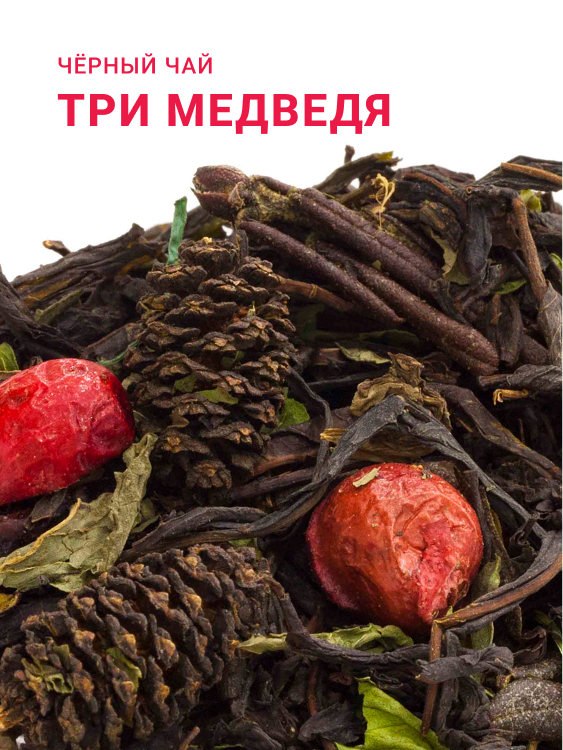 Купаж классического чёрного чая с иван-чаем с добавлением шишек, саган-дайли, мяты, ягод красной смородины и ягод и слайсов клюквы. Эти уникальные лесные ароматы зарядят энергией и снимут напряжение.