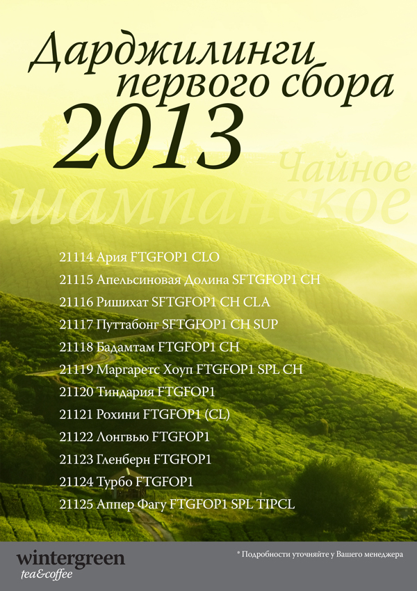 В начале сезона на плантации может производиться 125-150 кг готового чая, поэтому предложение такого чая крайне ограничено. Wintergreen один из немногих поставщиков, которые дают своим партнерам возможность украсить чайную коллекцию дарджилингами первого сбора! Так что тем, кто хочет удивить своих клиентов настоящим эксклюзивом, следует поторопиться.