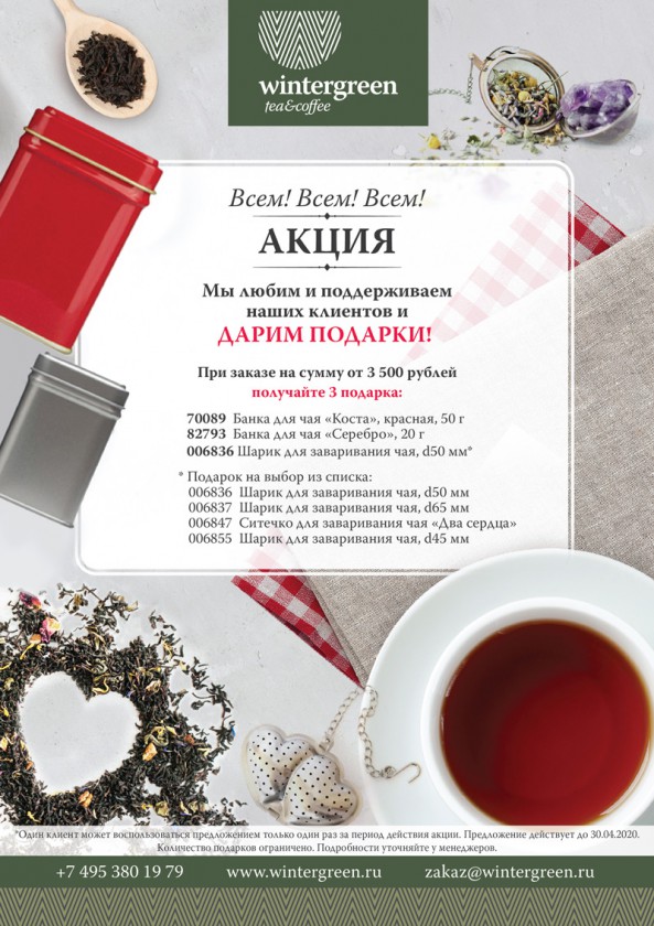 При заказе на сумму от 3500 рублей получайте 3 подарка: - банку для чая "Коста"; - банку для чая "Серебро"; - шарик для заваривания чая.
