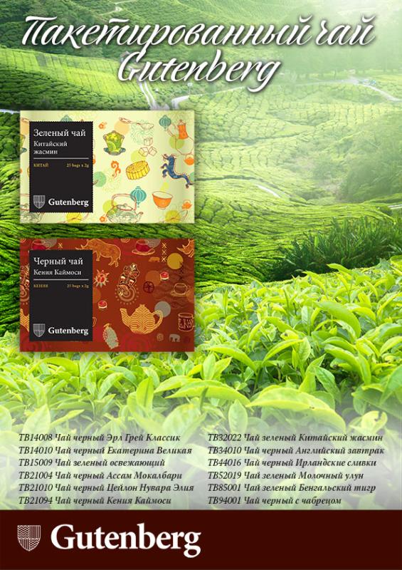 Новинка: популярные сорта чая Gutenberg теперь в новом формате – пакетированный чай. Пористая структура фильтр-пакетиков позволяет сохранить неповторимый завораживающий аромат и незабываемый насыщенный вкус чая.