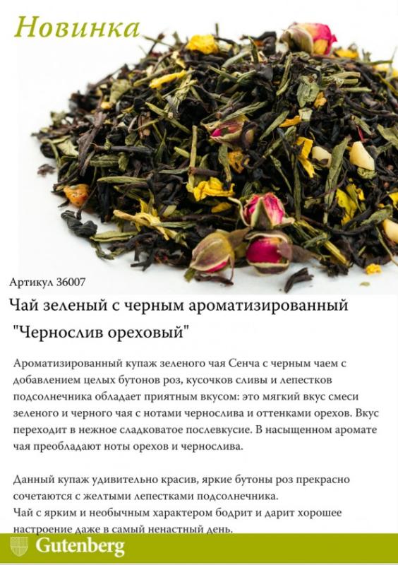 Чай зеленый с черным ароматизированный "Чернослив ореховый" (артикул 36007) - купаж зеленого чая Сенча с черным чаем с добавлением целых бутонов роз, кусочков сливы и лепестков подсолнечника обладает приятным вкусом: это мягкий вкус смеси зеленого и черного чая с нотами чернослива и оттенками орехов. Вкус переходит в нежное сладковатое послевкусие. В насыщенном аромате чая преобладают ноты орехов и чернослива.