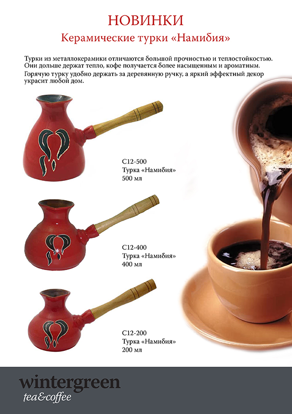 Турки из металлокерамики с ярким эффектным декором из глазури и удобной, не нагревающейся деревянной ручкой. Отличается большей прочностью и теплостойкостью, чем керамические турки. Дольше держит тепло, обеспечивая длительное кипение напитка, которое продолжится и после того, как турка снята с огня. Изделие требует бережного ухода.