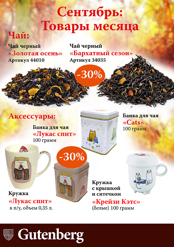 В сентябре сезонные вкусы: черный чаи "Золотая осень" и "Бархатный сезон" со скидкой 30%!