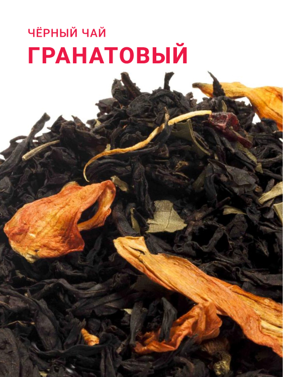 Чай чёрный с цветами лилии, листом грецкого ореха, барбарисом и ароматом граната.