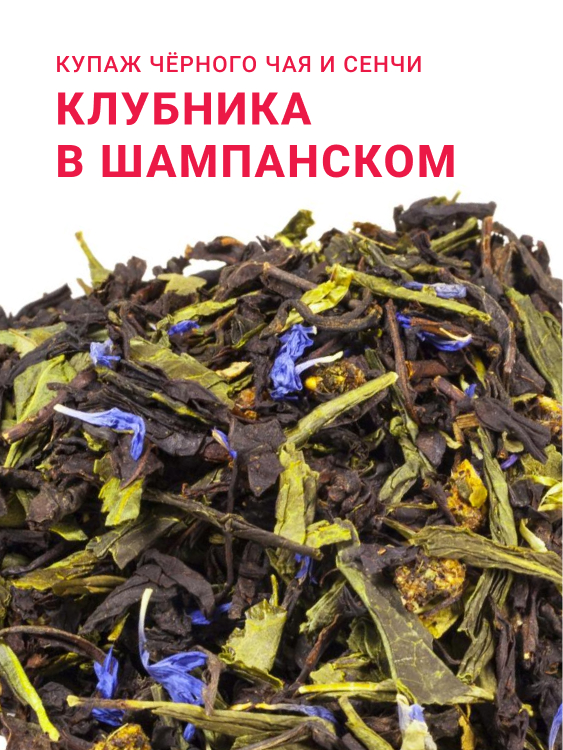 Купаж чёрного чая с зелёным чаем сенча, лепестки василька, листьями и кусочками клубники.